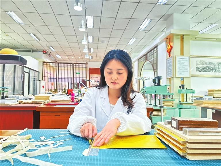 今年23歲的羅雪瑞是保護(hù)中心里的古籍修復(fù)師。她告訴記者:“在學(xué)校時(shí)學(xué)的是工藝美術(shù)品設(shè)計(jì)專(zhuān)業(yè)書(shū)畫(huà)裝裱方向,需要很強(qiáng)的動(dòng)手能力,這為古籍修復(fù)工作打下了很好的基礎(chǔ)。”