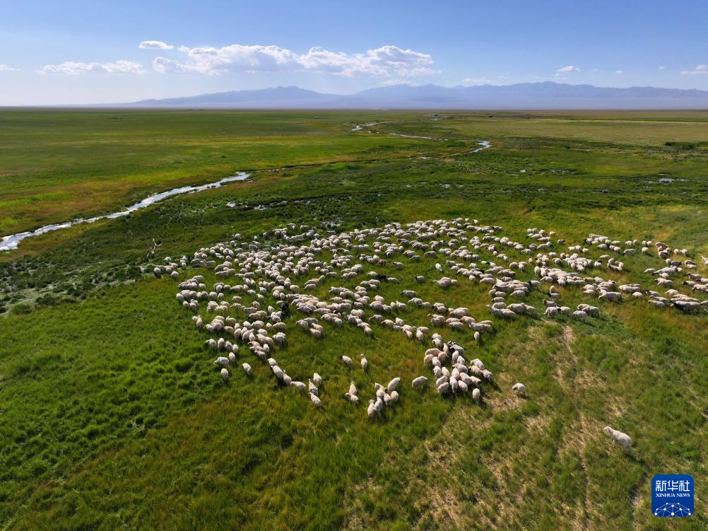 7月30日,羊群在小蘇干湖濕地覓食(無人機(jī)照片)。新華社發(fā)(高宏善 攝)