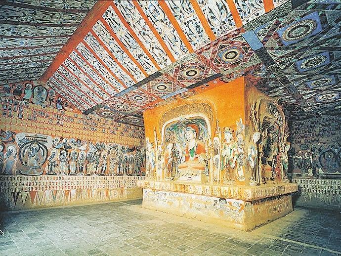 另一個創(chuàng)新改良的洞窟建筑是中心塔柱窟,其原型是印度支提窟。洞窟平面多呈倒U形;窟內(nèi)空間多被兩列石柱縱向分成三部分,中間是主室,既寬又高,兩邊是側廊,較低而且比較窄;主室前端是入口,后端是半圓形后室;后室中央雕鑿佛塔,兩側石柱在佛塔后部相接;主室的頂部為縱向肋骨筒拱,側廊頂部為半圓扇形。這樣佛教徒就可以經(jīng)過側廊進行繞塔禮拜。在莫高窟北朝第二期洞窟里,中心塔柱才開始大量出現(xiàn),并一直興盛到初唐。