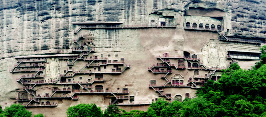 麥積山石窟與敦煌莫高窟、大同云岡石窟、洛陽(yáng)龍門石窟齊名,是中國(guó)四大石窟之一,被譽(yù)為“東方雕塑陳列館”。公元759年杜甫流寓天水,作《山寺》詩(shī):“野寺殘僧少,山園細(xì)路高。麝香眠石竹,鸚鵡啄金桃。亂石通人過(guò),懸崖置屋牢。上方重閣晚,百里見(jiàn)秋毫。”其自然景觀與人文景觀完美結(jié)合,是世界文化遺產(chǎn)、全國(guó)重點(diǎn)文物保護(hù)單位,也是中原北方地區(qū)最早的皇家石窟,洞窟內(nèi)還保存了中國(guó)最早的連環(huán)畫作品。
