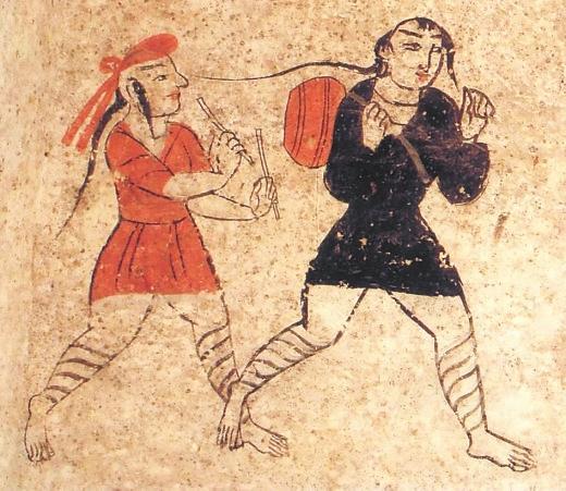 除此之外,河西彩繪壁畫(huà)磚圖像中,還有一些反映娛樂(lè)的圖像,主要有樂(lè)舞圖和六博圖。高臺(tái)地埂坡壁畫(huà)中的“角抵百戲”中,一著辮者在作表演,他小腿部網(wǎng)狀綁腿,蹲踞,雙手?jǐn)傞_(kāi),似乎是在表演魔術(shù),又似乎是在歡迎到場(chǎng)的人們。“擊鼓”中,兩人網(wǎng)狀繃腿,髡發(fā)梳辮,著黑裝者背鼓,著紅裝者持雙鼓槌準(zhǔn)備擊鼓。孫機(jī)先生謂,戰(zhàn)國(guó)迄漢盛行六博,博具和博戲的圖像在考古資料中不乏其例。甘肅以武威磨嘴子漢墓出土木六博俑為例。六博俑以簡(jiǎn)單明確的藝術(shù)造型,刻畫(huà)了兩個(gè)老者全神貫注博弈的場(chǎng)面,惟妙惟肖地表現(xiàn)出對(duì)弈時(shí)蓄勢(shì)待發(fā)的場(chǎng)面。在高臺(tái)壁畫(huà)墓中的博戲場(chǎng)面略有不同,二博者戴船形帽,打手勢(shì)。從相貌看,很可能是少數(shù)民族。高臺(tái)出土彩繪壁畫(huà)磚上,兩人動(dòng)作幅度更大,左邊一人的黃紅色著裝和博具上的零散物品,顯得場(chǎng)面更為熱烈激情。
