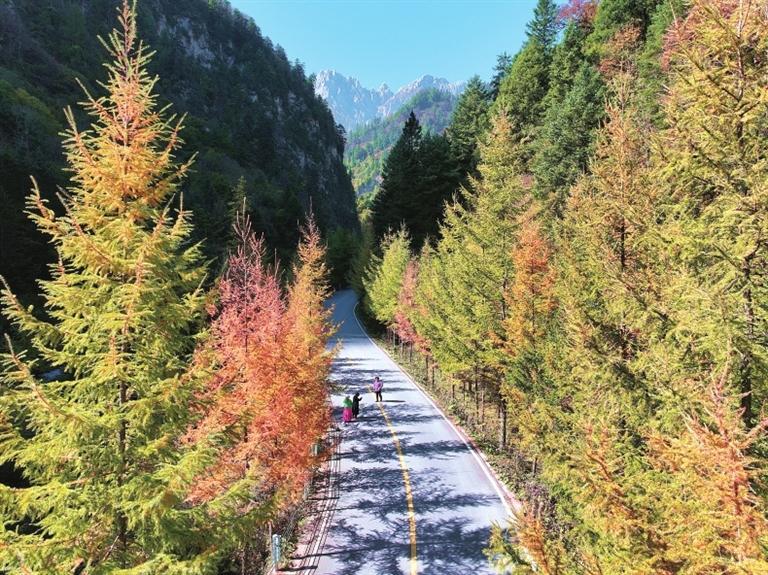 金秋時(shí)節(jié),位于宕昌縣的官鵝溝國家森林公園秋色盡染,斑斕如畫。