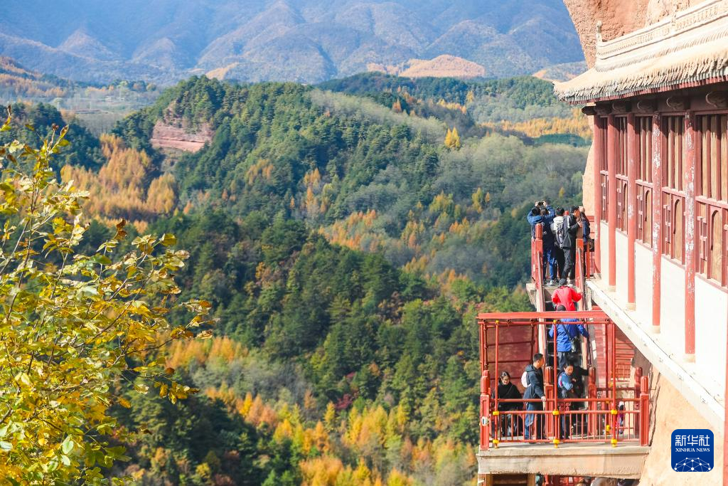 晚秋時(shí)節(jié),位于甘肅省天水市的麥積山石窟與層林盡染的山巒構(gòu)成絢爛的秋色畫(huà)卷,吸引了不少游客前來(lái)參觀游覽。