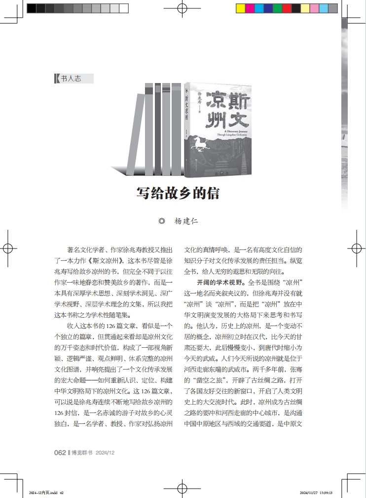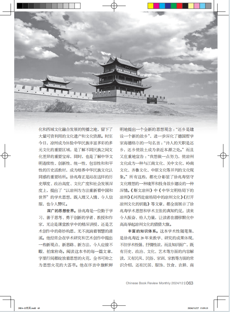收入這本書的126篇文章,看似是一個(gè)個(gè)獨(dú)立的篇章,但貫通起來看卻是涼州文化的萬千姿態(tài)和時(shí)代價(jià)值,構(gòu)成了一部視角新穎、邏輯嚴(yán)謹(jǐn)、觀點(diǎn)鮮明、體系完整的涼州文化圖譜,并響亮提出了一個(gè)文化傳承發(fā)展的宏大命題——如何重新認(rèn)識、定位、構(gòu)建中華文明格局下的涼州文化。這 126 篇文章,可以說是徐兆壽連續(xù)不斷地寫給故鄉(xiāng)涼州的126封信,是一名赤誠的游子對故鄉(xiāng)的心靈獨(dú)白,是一名學(xué)者、教授、作家對弘揚(yáng)涼州文化的真情呼喚,是一名有高度文化自信的知識分子對文化傳承發(fā)展的責(zé)任擔(dān)當(dāng)??v覽全書,給人無窮的遐思和無限的向往。