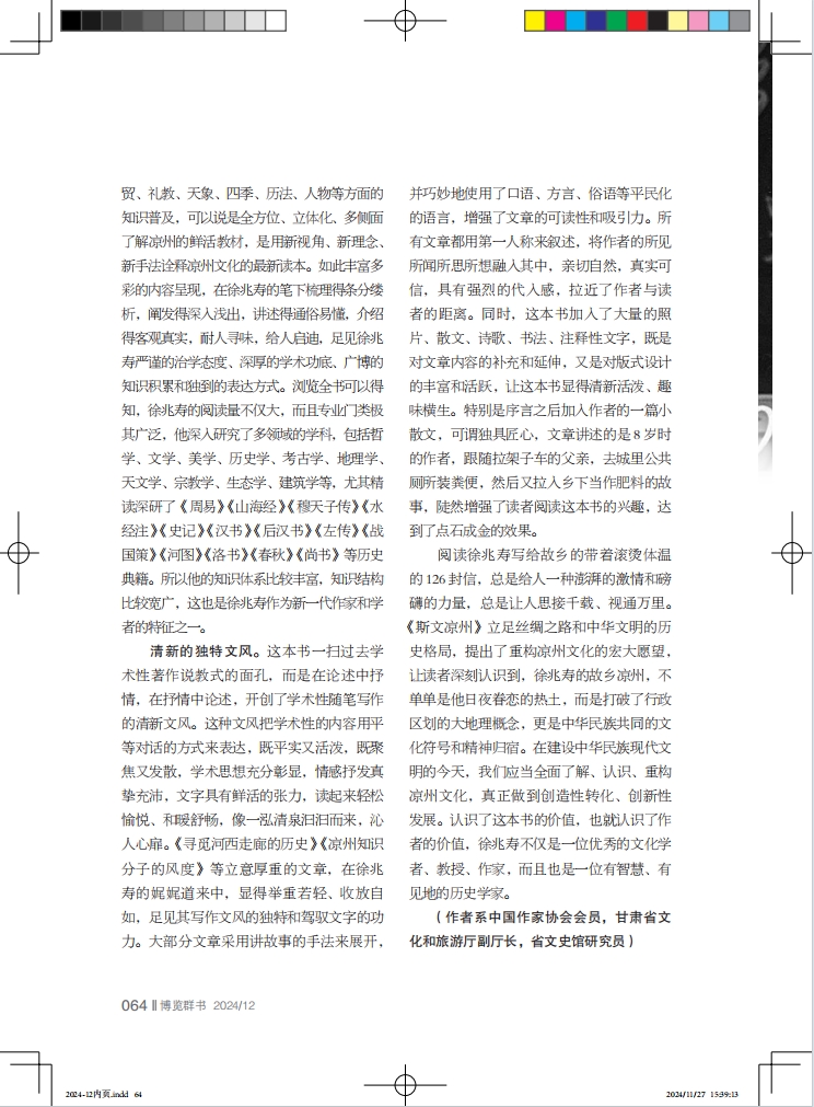 豐富的知識體系。這本學(xué)術(shù)性隨筆集,是徐兆壽近20年來教學(xué)、研究的成果體現(xiàn),不但學(xué)術(shù)性強(qiáng)、抒情性濃,而且知識面廣,既有歷史、政治、文化、藝術(shù)等方面的內(nèi)容解讀,又有民風(fēng)、民俗、家訓(xùn)、家教等方面的常識介紹,還有民居、服飾、飲食、農(nóng)耕、商貿(mào)、禮教、天象、四季、歷法、人物等方面的知識普及,可以說是全方位、立體化、多側(cè)面了解涼州的鮮活教材,是用新視角、新理念、新手法詮釋涼州文化的最新讀本。如此豐富多彩的內(nèi)容呈現(xiàn),在徐兆壽的筆下梳理得條分縷析,闡發(fā)得深入淺出,講述得通俗易懂,介紹得客觀真實(shí),耐人尋味,給人啟迪,足見徐兆壽嚴(yán)謹(jǐn)?shù)闹螌W(xué)態(tài)度、深厚的學(xué)術(shù)功底、廣博的知識積累和獨(dú)到的表達(dá)方式。瀏覽全書可以得知,徐兆壽的閱讀量不僅大,而且專業(yè)門類極其廣泛,他深入研究了多領(lǐng)域的學(xué)科,包括哲學(xué)、文學(xué)、美學(xué)、歷史學(xué)、考古學(xué)、地理學(xué)、天文學(xué)、宗教學(xué)、生態(tài)學(xué)、建筑學(xué)等,尤其精讀深研了《周易》《山海經(jīng)》《穆天子傳》《水經(jīng)注》《史記》《漢書》《后漢書》《左傳》《戰(zhàn)國策》《河圖》《洛書》《春秋》《尚書》等歷史典籍。所以他的知識體系比較豐富,知識結(jié)構(gòu)比較寬廣,這也是徐兆壽作為新一代作家和學(xué)者的特征之一。