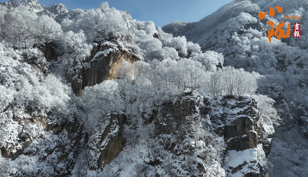 云霧繚繞中,太子山主峰巍峨壯觀,翠色與白雪交織,綿延起伏的山巒溝壑被銀裝緊緊包裹,閃爍著迷人的光芒。