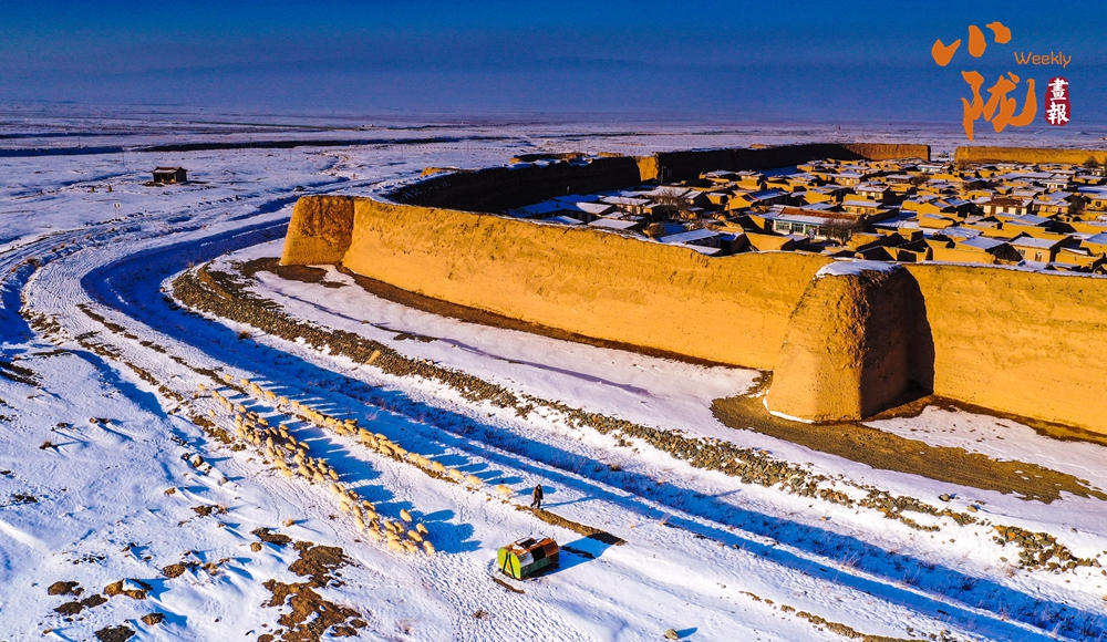 陽光照耀著古城墻,閃爍著淡淡的金光。羊群回歸古城,在白雪覆蓋的戈壁灘留下了串串蹄印,生命的希望就在潔凈的雪中孕育。
