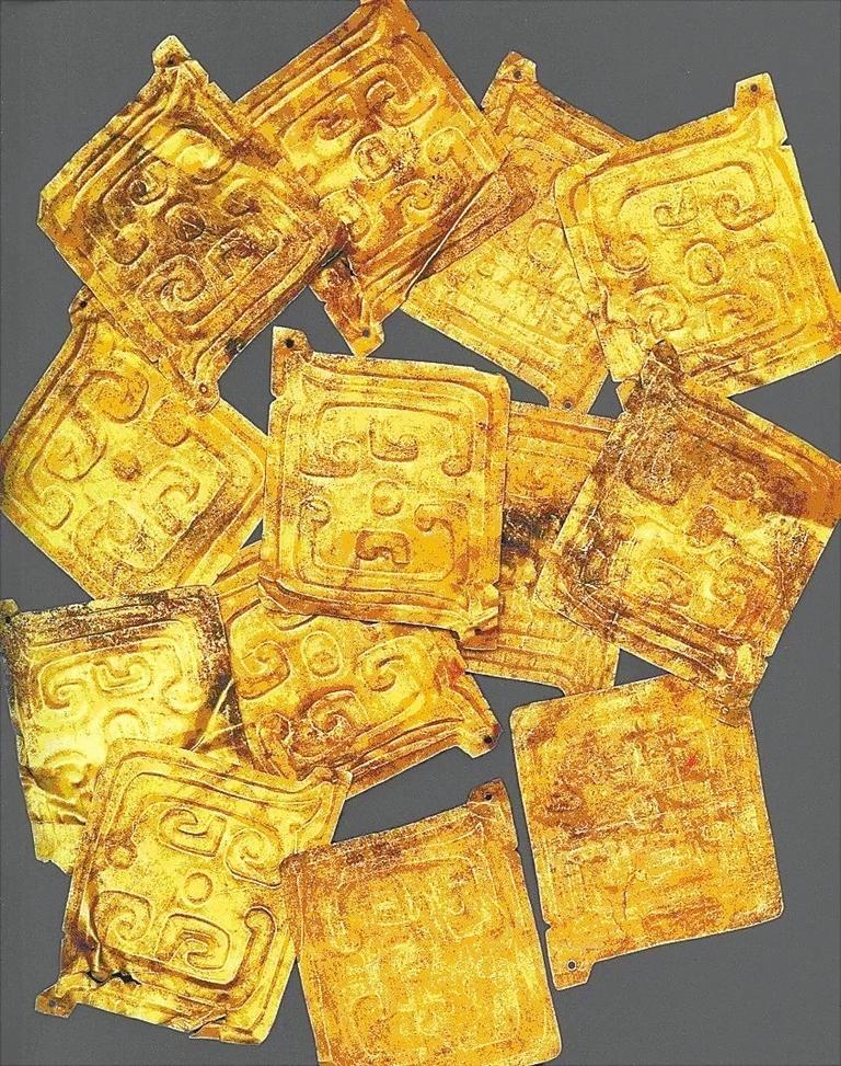 1994年春,陜西省考古研究所所長韓偉在法國、比利時(shí)訪問期間,見到了一批從香港過來的金飾片和一對(duì)金虎。韓偉先生對(duì)這組金飾片從器形、紋飾進(jìn)行了分析,并參考蘇黎世研究員莫爾夫人從金虎內(nèi)提取的木制標(biāo)本碳-14檢測結(jié)果,認(rèn)為這批金飾片為西周晚期秦人首領(lǐng)秦仲或秦莊公墓棺上的裝飾物。