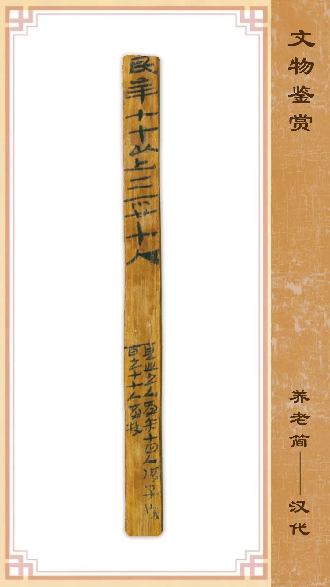 1990年出土于甘肅省敦煌懸泉置遺址,長(zhǎng)22.8厘米,寬1厘米,紅柳材質(zhì)。該簡(jiǎn)記載分類(lèi)統(tǒng)計(jì)高年老人享受的待遇,是西漢后期養(yǎng)老制度的反映。
