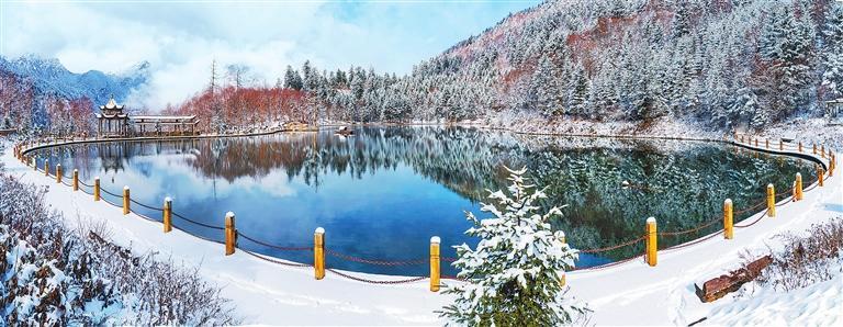 眺望遠(yuǎn)方,潔白的冰雪與擂鼓山遙相輝映,雪花盡飛處,仿佛細(xì)碎的春天早已鋪滿了原野。燕子湖的豐盈昭示著來年的風(fēng)調(diào)雨順,羊頭圖騰穿越千年的風(fēng)景,搖曳著鳳凰騰飛的美夢。一個個湖畔,色彩暖暖的羌式小屋,靜靜地享受著冬日的安寧與愜意。