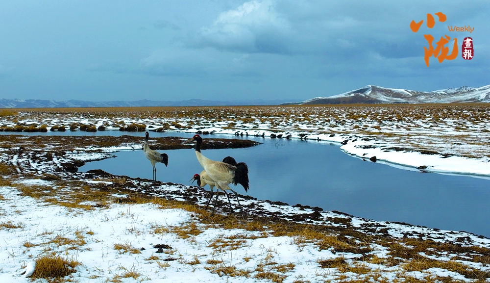 “高原精靈”黑頸鶴身披黑白相間的羽衣,舒展著身體,或低頭覓食,它們優(yōu)雅的身姿成為冬日里一道亮麗的風景線。