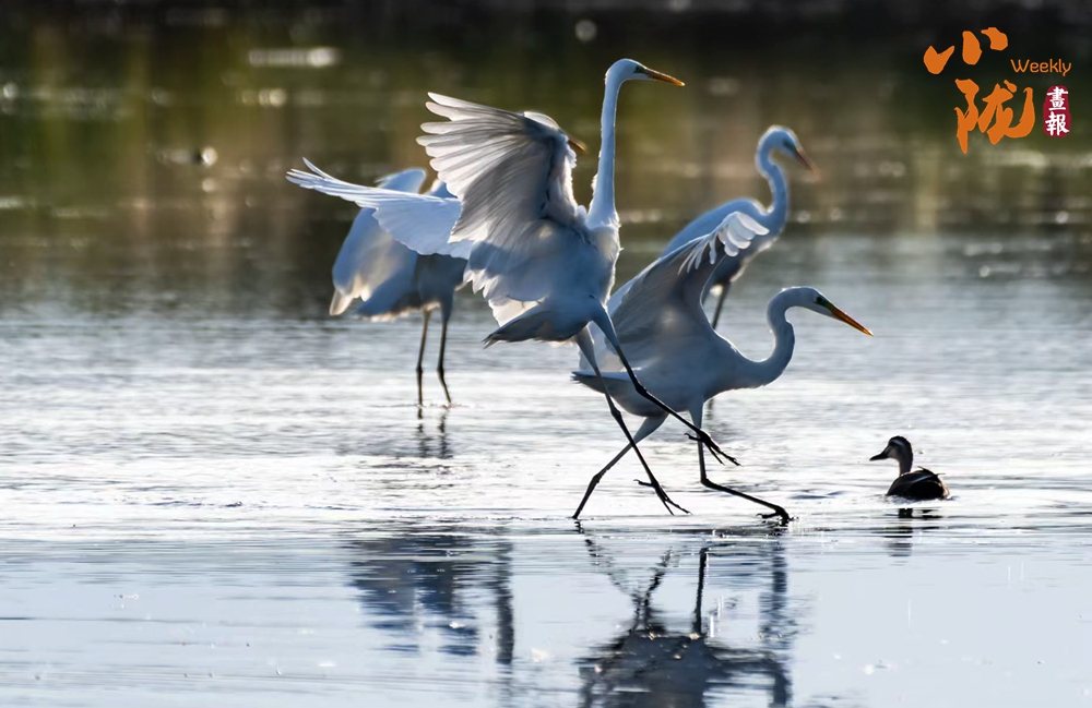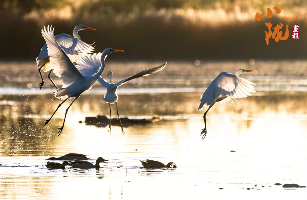 湖中的白鷺翩翩起舞,嬉鬧翻飛,歡快鳴叫,有的停落湖岸,有的游向湖心,有的翻飛空中,為游客帶來無盡的歡樂??带B兒們嬉鬧,仿佛回到童年時代。自由、自在、生機(jī)無限,讓每個人感受到無窮的生命力量。