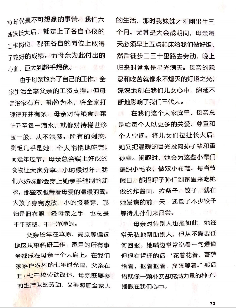 由于母親放棄了自己的工作,全家生活全靠父親的工資支撐。但母親治家有方,勤儉為本,將全家打理得井井有條。母親對(duì)待糧食、菜葉乃至每一滴水,就像對(duì)待稀世珍寶一般,從不浪費(fèi)。所有的剩菜、剩飯幾乎是她一個(gè)人悄悄地吃完。而逢年過節(jié),母親總會(huì)端上好吃的食物讓大家分享。小時(shí)候過年,我們六姊妹都會(huì)穿上她親手縫制的新衣,那些衣服帶著母愛的溫暖羽翼。大孩子穿完改改,小的接著穿,哪怕是舊衣服,經(jīng)母親之手,也總是平平整整、干干凈凈的。