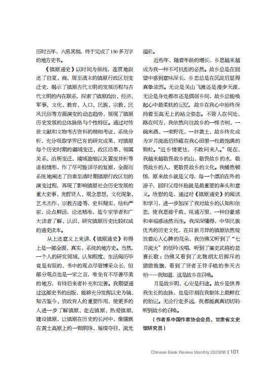 近些年,隨著年齡的增長,鄉(xiāng)思越來越成為我一種不可抗拒的必然。故鄉(xiāng)總是在回望中感到意味深長,鄉(xiāng)戀總是在沉淀后顯得真摯濃烈。無論是關(guān)山飛渡還是漫步天涯,無論是身處都市還是偶居鄉(xiāng)間,故鄉(xiāng)總能喚起心中最柔軟的記憶,故鄉(xiāng)在我心中始終保持著至高無上的站立姿態(tài)。不管人在何處,路在何方,我依然向往故鄉(xiāng)的一棵杏樹、一碗米酒、一束野花、一抔黃土,故鄉(xiāng)終究成為歲月流逝后珍藏在我心田里一枚最飽滿的顆粒。“近鄉(xiāng)情更怯,不敢問來人。”現(xiàn)在,我越來越敬畏故鄉(xiāng)的山,敬畏故鄉(xiāng)的水,敬畏故鄉(xiāng)的人,更敬畏故鄉(xiāng)的文化。我幡然頓悟,原來故鄉(xiāng)就是父母,每一個漂泊在外的游子,回歸父母懷抱就是最重要的奔頭和意義。欣慰的是,通過對《鎮(zhèn)原通史》的閱讀和學(xué)習(xí),進(jìn)一步加深了我對故鄉(xiāng)的認(rèn)知和依戀,使我思接千載、視通萬里,一種自豪感和幸福感油然而生。我深深懂得,中華民族優(yōu)秀的歷史文化,在日新月異的鎮(zhèn)原依然綻放著沁人心脾的花朵,我仿佛又聽到了“七月流火”的低吟淺唱,聽到了廉吏武將的悲喜長歌 ;仿佛又看到了北魏胡太后揮斥的獵獵旌旗,看到了賢者王符手植的參天古柏……我知道,這是故鄉(xiāng)在召喚。月是故鄉(xiāng)明,心安是歸途。故鄉(xiāng)是供養(yǎng)我生長的血脈,也是印刻在我軀體上最鮮紅的胎記。無論行走多遠(yuǎn),我都能真真切切聆聽到故鄉(xiāng)的召喚。