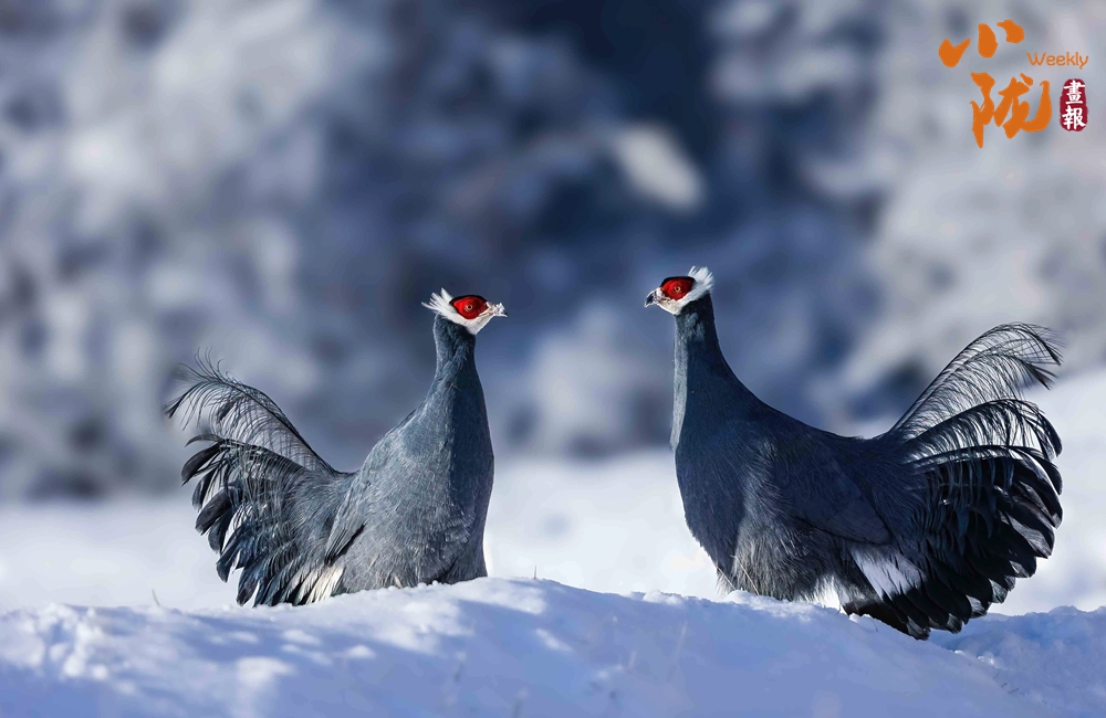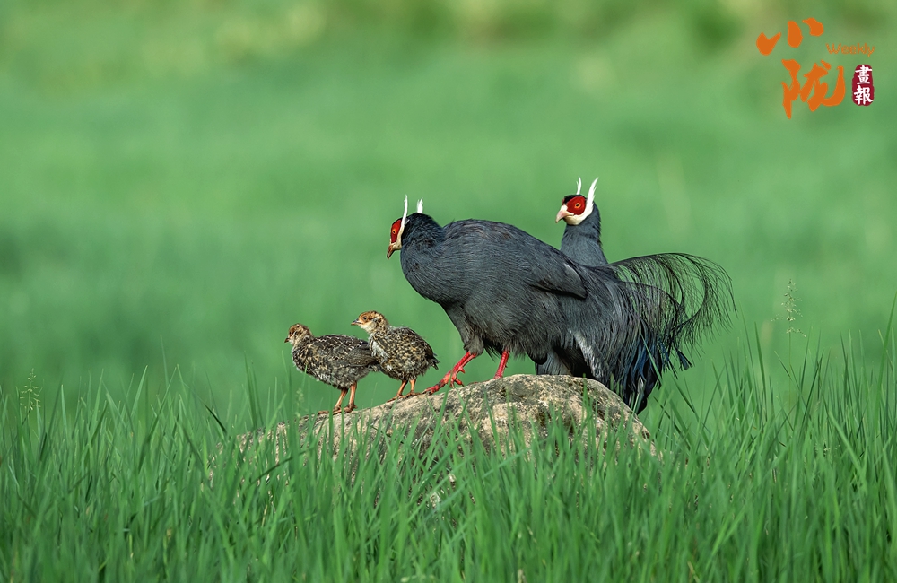 珍貴稀有的國家二級重點保護動物藍馬雞,體型較大,通體藍灰色,頸項和肩部顏色更深,閃爍著金屬般的輝亮。其尾羽特別長,由灰藍色漸變?yōu)榘底纤{色,并渲染著金屬綠和金屬紫藍色,24枚尾羽中,中央一對尾羽特別長,富有彈性,彎曲成一個美麗的弧形,高高地翹在其他尾羽之上,披散下垂如馬尾,因而得名。此外,藍馬雞的頭側緋紅,耳羽簇白色并突出于頸部頂上,為其增添了獨特的魅力。