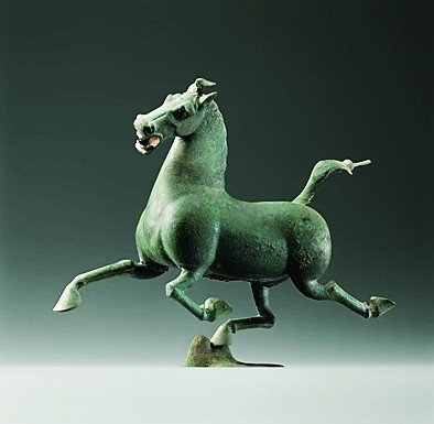 走進(jìn)甘肅省博物館,這匹東漢神駒,仿佛正在飛馳,攫住了所有人的目光——它全身呈流線型,肌肉健碩有力。它的口、眼、鼻均張開,三足騰空而起,一足踏于飛鳥之上,在飛鳥回首驚顧的一剎那,它已超越流星般飛行的鳥向前而去。馬的奔騰嘶鳴和風(fēng)的呼嘯猶在耳畔,這個風(fēng)馳電掣的瞬間也被定格成永恒。