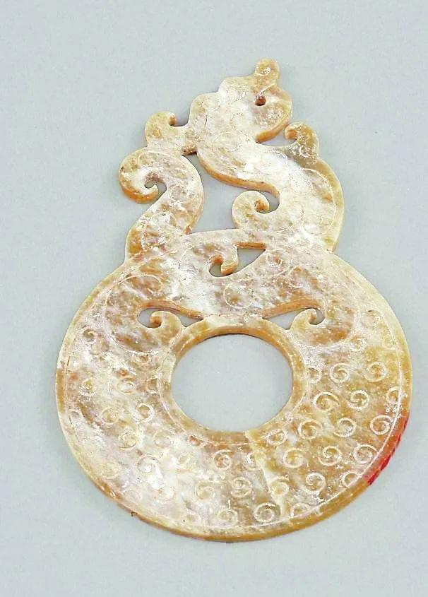玉璧通高11厘米、直徑6.9厘米、孔徑2.4厘米、厚0.4厘米,征集品。玉料為青玉,整體顏色為青灰色,有灰白沁。琢磨成形,體呈平片狀。下部呈圓形,中有圓孔,孔徑小于肉寬,三分之二雕稀疏谷紋。龍首與龍尾出于璧廓之外,腹部鏤雕在璧孔之上的肉部,有三個(gè)一端彎鉤的三角狀鏤孔,其中下部兩個(gè)鏤孔左右對稱。龍昂首,軀體屈曲,尾部卷而上貼首后,有騰空而起之勢。龍首尾之間有一個(gè)不規(guī)則的大鏤孔,龍嘴上有一圓形小系孔。