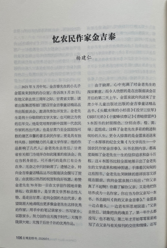 由于缺席,心中充滿了對(duì)金老先生的深深歉意。而令人欣慰的是在出版座談會(huì)召開(kāi)后的第二天上午,金雷泉就向我送來(lái)了甘肅少年兒童出版社出版的金吉泰童話精品叢書,《頭戴水珠的小杉苗》《沒(méi)牙三弦琴》《銅環(huán)兄弟》《小蜜蜂偵察記》《青蛙借雷聲》5本圖書的封面顏色,分別由赤、橙、黃、綠、藍(lán)組成,詮釋了金老先生多彩的軌跡和繽紛的人生。更令人驚喜的是金雷泉還送來(lái)了一本厚厚的紀(jì)念文集《為文學(xué)而生——中國(guó)農(nóng)民作家金吉泰》,從書名到內(nèi)容,都高度凝練了金老先生一生的信仰追求和奮斗歷程,這6本圖書比較全面地展示出了金老先生的文學(xué)成果和精神圖譜。手捧著沉甸甸的這些圖書,金老先生笑瞇瞇的慈祥面容又浮現(xiàn)在眼前,我向金雷泉脫口而出:“你父親真了不起?。∧阕盍私饽愀赣H,又是他把你培養(yǎng)成為一名作家,你應(yīng)當(dāng)為你父親寫一本書,書名就叫《我的父親金吉泰》。”金雷泉一邊點(diǎn)著頭,一邊若有所思地說(shuō)道:“父親去世后,就像把我的魂丟了,第一年什么都沒(méi)寫,也不敢寫,第二年才開(kāi)始零零星星地寫了點(diǎn)父親與有關(guān)報(bào)刊的交往和情緣,還寫了點(diǎn)父親在生活和寫作中的軼事趣聞。您的建議非常好,我擔(dān)心駕馭不好,試試看吧。”我感覺(jué)金雷泉有點(diǎn)為難,馬上又安慰他:“不急,你用兩三年時(shí)間慢慢寫。”