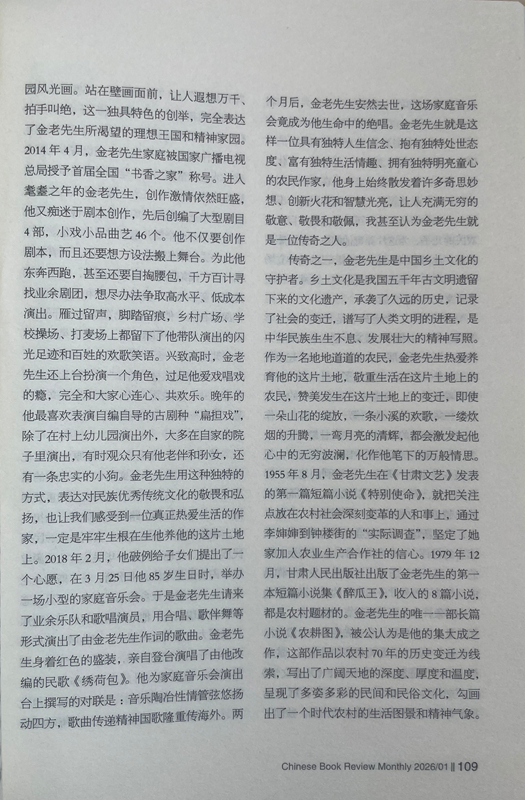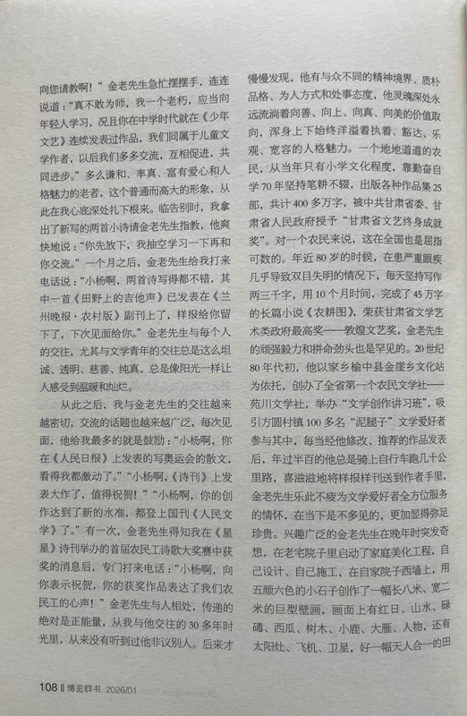 從此之后,我與金老先生的交往越來(lái)越密切,交流的話題也越來(lái)越廣泛,每次見(jiàn)面,他給我最多的就是鼓勵(lì):“小楊啊,你在《人民日?qǐng)?bào)》上發(fā)表的寫奧運(yùn)會(huì)的散文,看得我都激動(dòng)了。”“小楊啊,《詩(shī)刊》上發(fā)表大作了,值得祝賀!”“小楊啊,你的創(chuàng)作達(dá)到了新的水準(zhǔn),都登上國(guó)刊《人民文學(xué)》了。”有一次,金老先生得知我在《星星》詩(shī)刊舉辦的首屆農(nóng)民工詩(shī)歌大獎(jiǎng)賽中獲獎(jiǎng)的消息后,專門打來(lái)電話:“小楊啊,向你表示祝賀,你的獲獎(jiǎng)作品表達(dá)了我們農(nóng)民工的心聲!”金老先生與人相處,傳遞的絕對(duì)是正能量,從我與他交往的30多年時(shí)光里,從來(lái)沒(méi)有聽(tīng)到過(guò)他非議別人。后來(lái)才慢慢發(fā)現(xiàn),他有與眾不同的精神境界、質(zhì)樸品格、為人方式和處事態(tài)度,他靈魂深處永遠(yuǎn)流淌著向善、向上、向真、向美的價(jià)值取向,渾身上下始終洋溢著執(zhí)著、豁達(dá)、樂(lè)觀、寬容的人格魅力。一個(gè)地地道道的農(nóng)民,從當(dāng)年只有小學(xué)文化程度,靠勤奮自學(xué)70年堅(jiān)持筆耕不輟,出版各種作品集25部,共計(jì)400多萬(wàn)字,被中共甘肅省委、甘肅省人民政府授予“甘肅省文藝終身成就獎(jiǎng)”。對(duì)一個(gè)農(nóng)民來(lái)說(shuō),這在全國(guó)也是屈指可數(shù)的。年近80歲的時(shí)候,在患嚴(yán)重眼疾幾乎導(dǎo)致雙目失明的情況下,每天堅(jiān)持寫作兩三千字,用10個(gè)月時(shí)間,完成了45萬(wàn)字的長(zhǎng)篇小說(shuō)《農(nóng)耕圖》,榮獲甘肅省文學(xué)藝術(shù)類政府最高獎(jiǎng)——敦煌文藝獎(jiǎng),金老先生的頑強(qiáng)毅力和拼命勁頭也是罕見(jiàn)的。20世紀(jì)80年代初,他以家鄉(xiāng)榆中縣金崖鄉(xiāng)文化站為依托,創(chuàng)辦了全省第一個(gè)農(nóng)民文學(xué)社——苑川文學(xué)社,舉辦“文學(xué)創(chuàng)作講習(xí)班”,吸引方圓村鎮(zhèn)100多名“泥腿子”文學(xué)愛(ài)好者參與其中,每當(dāng)經(jīng)他修改、推薦的作品發(fā)表后,年過(guò)半百的他總是騎上自行車跑幾十公里路,喜滋滋地將樣報(bào)樣刊送到作者手里,金老先生樂(lè)此不疲為文學(xué)愛(ài)好者全方位服務(wù)的情懷,在當(dāng)下是不多見(jiàn)的,更加顯得彌足珍貴。興趣廣泛的金老先生在晚年時(shí)突發(fā)奇想,在老宅院子里啟動(dòng)了家庭美化工程,自己設(shè)計(jì)、自己施工,在自家院子西墻上,用五顏六色的小石子創(chuàng)作了一幅長(zhǎng)八米、寬二米的巨型壁畫,畫面上有紅日、山水、碌碡、西瓜、樹(shù)木、小鹿、大雁、人物,還有太陽(yáng)灶、飛機(jī)、衛(wèi)星,好一幅天人合一的田園風(fēng)光畫。站在壁畫面前,讓人遐想萬(wàn)千、拍手叫絕,這一獨(dú)具特色的創(chuàng)舉,完全表達(dá)了金老先生所渴望的理想王國(guó)和精神家園。2014年4月,金老先生家庭被國(guó)家廣播電視總局授予首屆全國(guó)“書香之家”稱號(hào)。進(jìn)入耄耋之年的金老先生,創(chuàng)作激情依然旺盛,他又癡迷于劇本創(chuàng)作,先后創(chuàng)編了大型劇目4部,小戲小品曲藝46個(gè)。他不僅要?jiǎng)?chuàng)作劇本,而且還要想方設(shè)法搬上舞臺(tái)。為此他東奔西跑,甚至還要自掏腰包,千方百計(jì)尋找業(yè)余劇團(tuán),想盡辦法爭(zhēng)取高水平、低成本演出。雁過(guò)留聲,腳踏留痕,鄉(xiāng)村廣場(chǎng)、學(xué)校操場(chǎng)、打麥場(chǎng)上都留下了他帶隊(duì)演出的閃光足跡和百姓的歡歌笑語(yǔ)。興致高時(shí),金老先生還上臺(tái)扮演一個(gè)角色,過(guò)足他愛(ài)戲唱戲的癮,完全和大家心連心、共歡樂(lè)。晚年的他最喜歡表演自編自導(dǎo)的古劇種“扁擔(dān)戲”,除了在村上幼兒園演出外,大多在自家的院子里演出,有時(shí)觀眾只有他老伴和孫女,還有一條忠實(shí)的小狗。金老先生用這種獨(dú)特的方式,表達(dá)對(duì)民族優(yōu)秀傳統(tǒng)文化的敬畏和弘揚(yáng),也讓我們感受到一位真正熱愛(ài)生活的作家,一定是牢牢生根在生他養(yǎng)他的這片土地上。2018年2月,他破例給子女們提出了一個(gè)心愿,在3月25日他85歲生日時(shí),舉辦一場(chǎng)小型的家庭音樂(lè)會(huì)。于是金老先生請(qǐng)來(lái)了業(yè)余樂(lè)隊(duì)和歌唱演員,用合唱、歌伴舞等形式演出了由金老先生作詞的歌曲。金老先生身著紅色的盛裝,親自登臺(tái)演唱了由他改編的民歌《繡荷包》。他為家庭音樂(lè)會(huì)演出臺(tái)上撰寫的對(duì)聯(lián)是:音樂(lè)陶冶性情管弦悠揚(yáng)動(dòng)四方,歌曲傳遞精神國(guó)歌隆重傳海外。兩個(gè)月后,金老先生安然去世,這場(chǎng)家庭音樂(lè)會(huì)竟成為他生命中的絕唱。金老先生就是這樣一位具有獨(dú)特人生信念、抱有獨(dú)特處世態(tài)度、富有獨(dú)特生活情趣、擁有獨(dú)特明亮童心的農(nóng)民作家,他身上始終散發(fā)著許多奇思妙想、創(chuàng)新火花和智慧光亮,讓人充滿無(wú)窮的敬意、敬畏和敬佩,我甚至認(rèn)為金老先生就是一位傳奇之人。