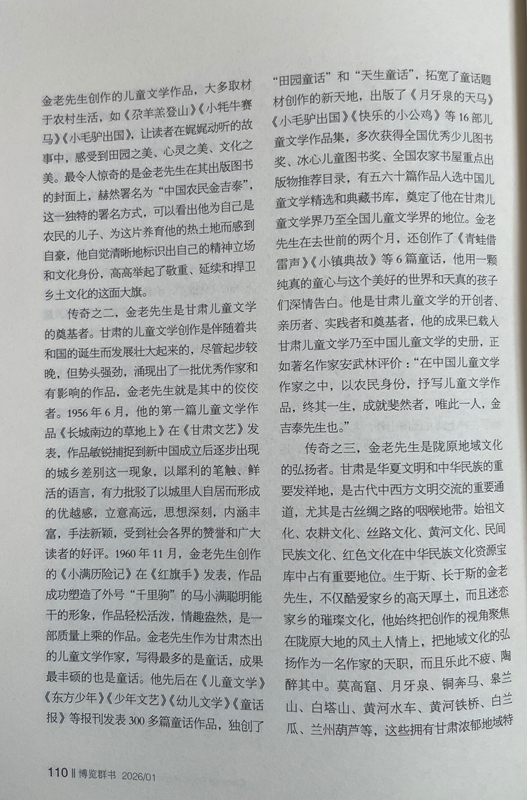 傳奇之二,金老先生是甘肅兒童文學(xué)的奠基者。甘肅的兒童文學(xué)創(chuàng)作是伴隨著共和國(guó)的誕生而發(fā)展壯大起來(lái)的,盡管起步較晚,但勢(shì)頭強(qiáng)勁,涌現(xiàn)出了一批優(yōu)秀作家和有影響的作品,金老先生就是其中的佼佼者。1956年6月,他的第一篇兒童文學(xué)作品《長(zhǎng)城南邊的草地上》在《甘肅文藝》發(fā)表,作品敏銳捕捉到新中國(guó)成立后逐步出現(xiàn)的城鄉(xiāng)差別這一現(xiàn)象,以犀利的筆觸、鮮活的語(yǔ)言,有力批駁了以城里人自居而形成的優(yōu)越感,立意高遠(yuǎn),思想深刻,內(nèi)涵豐富,手法新穎,受到社會(huì)各界的贊譽(yù)和廣大讀者的好評(píng)。1960年11月,金老先生創(chuàng)作的《小滿歷險(xiǎn)記》在《紅旗手》發(fā)表,作品成功塑造了外號(hào)“千里駒”的馬小滿聰明能干的形象,作品輕松活潑,情趣盎然,是一部質(zhì)量上乘的作品。金老先生作為甘肅杰出的兒童文學(xué)作家,寫得最多的是童話,成果最豐碩的也是童話。他先后在《兒童文學(xué)》《東方少年》《少年文藝》《幼兒文學(xué)》《童話報(bào)》等報(bào)刊發(fā)表300多篇童話作品,獨(dú)創(chuàng)了“田園童話”和“天生童話”,拓寬了童話題材創(chuàng)作的新天地,出版了《月牙泉的天馬》《小毛驢出國(guó)》《快樂(lè)的小公雞》等16部?jī)和膶W(xué)作品集,多次獲得全國(guó)優(yōu)秀少兒圖書獎(jiǎng)、冰心兒童圖書獎(jiǎng)、全國(guó)農(nóng)家書屋重點(diǎn)出版物推薦目錄,有五六十篇作品入選中國(guó)兒童文學(xué)精選和典藏書庫(kù),奠定了他在甘肅兒童文學(xué)界乃至全國(guó)兒童文學(xué)界的地位。金老先生在去世前的兩個(gè)月,還創(chuàng)作了《青蛙借雷聲》《小鎮(zhèn)典故》等6篇童話,他用一顆純真的童心與這個(gè)美好的世界和天真的孩子們深情告白。他是甘肅兒童文學(xué)的開(kāi)創(chuàng)者、親歷者、實(shí)踐者和奠基者,他的成果已載入甘肅兒童文學(xué)乃至中國(guó)兒童文學(xué)的史冊(cè),正如著名作家安武林評(píng)價(jià):“在中國(guó)兒童文學(xué)作家之中,以農(nóng)民身份,抒寫兒童文學(xué)作品,終其一生,成就斐然者,唯此一人,金吉泰先生也。”