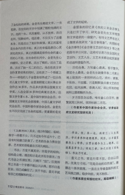 金雷泉的回憶錄《我的父親金吉泰》,只是打開(kāi)了學(xué)習(xí)、研究金老先生文學(xué)理想和文學(xué)追求的一扇窗戶,有待文藝界有志人士繼續(xù)系統(tǒng)研究“金吉泰現(xiàn)象”。我期盼有《金吉泰傳》《金吉泰文藝創(chuàng)作探究》等之類的圖書早日問(wèn)世,這將對(duì)甘肅乃至全國(guó)的文藝創(chuàng)作、文藝人生、文藝未來(lái)都會(huì)起到重要的啟迪和借鑒作用。