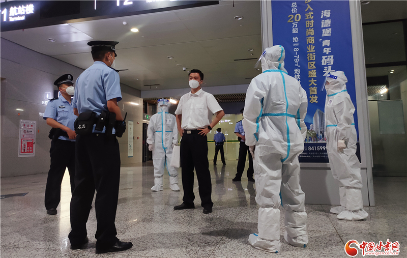 演練中,民警迅速處警,快速劃定隔離帶,并立即啟動應急預案,在對其進行警告無效后將該旅客強制帶離,并對參演人員進行徹底消殺與核酸采樣工作。