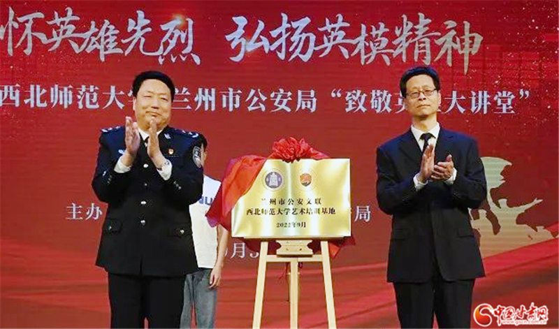 活動中,王立朝代表蘭州市公安局,接受了劉仲奎代表西北師范大學捐贈的8幅蘭州公安烈士畫像,向?qū)W校頒發(fā)收藏證書,并一同為“蘭州公安文聯(lián)西北師范大學藝術(shù)培訓基地”揭牌。蘭州公安竇勇烈士之子竇永杰、李鋼烈士之子李俊杰分別追憶父親的英雄事跡。“全國優(yōu)秀人民警察”、城關(guān)分局直屬大隊大隊長張子劍,“全國公安機關(guān)愛民模范集體”代表、市局刑警支隊電信網(wǎng)絡案件偵查大隊民警陳薈文分別作分享報告。學校師生和市公安局民輔警代表共同演繹詩朗誦《是誰》、合唱《少年壯志不言愁》,以多種形式緬懷英烈,致敬英雄。