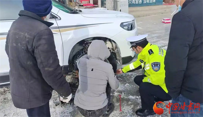 12月16日,永登縣公安局交警大隊(duì)民警為受困群眾安裝防滑鏈。