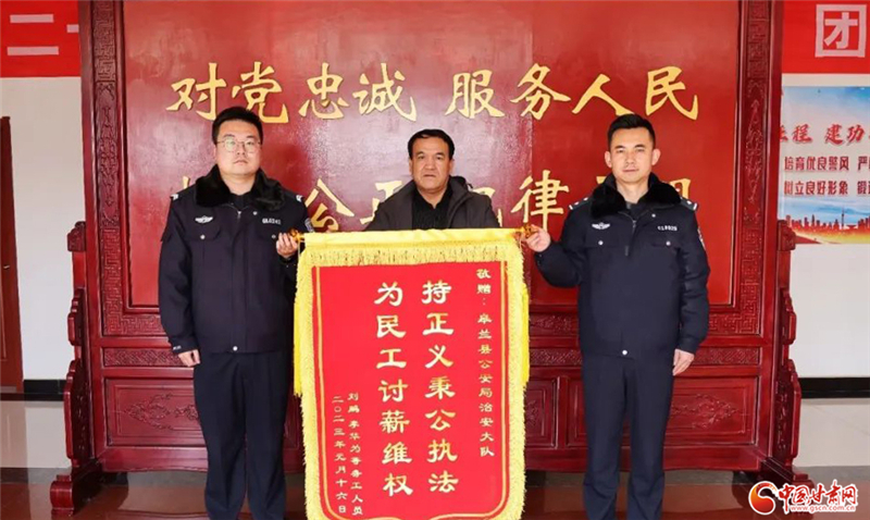 中國甘肅網(wǎng)2月3日訊(本網(wǎng)記者 程健)2月2日,劉先生代表20余名工友將一面印有“持正義秉公執(zhí)法,為民工討薪維權(quán)”的鮮紅錦旗送到了蘭州市皋蘭縣公安局,以此表達(dá)對(duì)縣局治安管理大隊(duì)民警幫其辛苦討要工資的感謝。