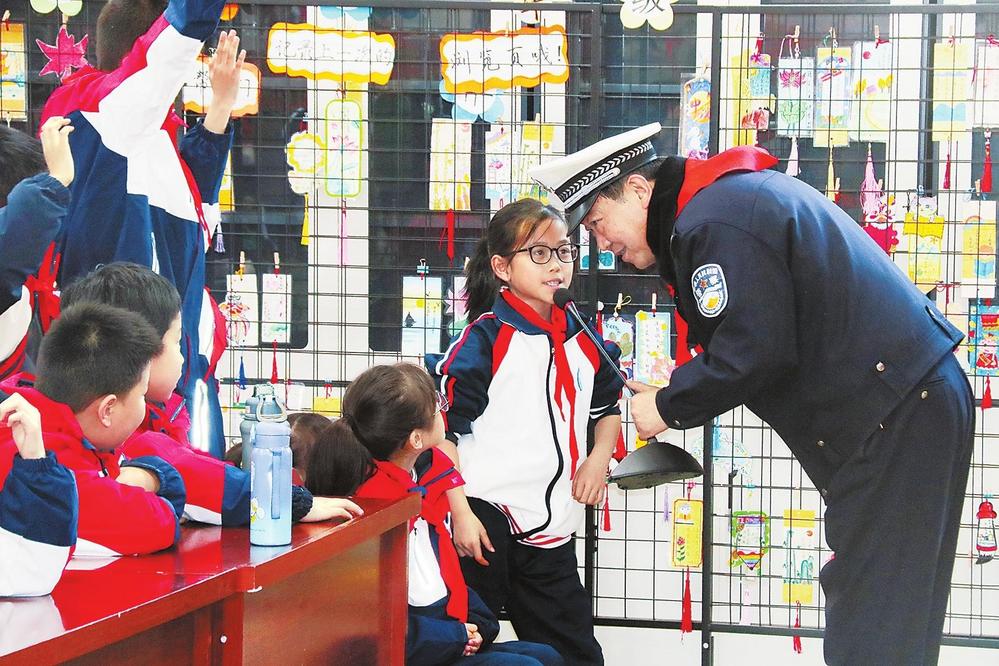 民警與同學生互動交流。2月26日,蘭州市公安局交警支隊紅古大隊民警走進學校,開展“小手牽大手”交通安全宣傳活動。新甘肅·甘肅法治報記者王輝攝