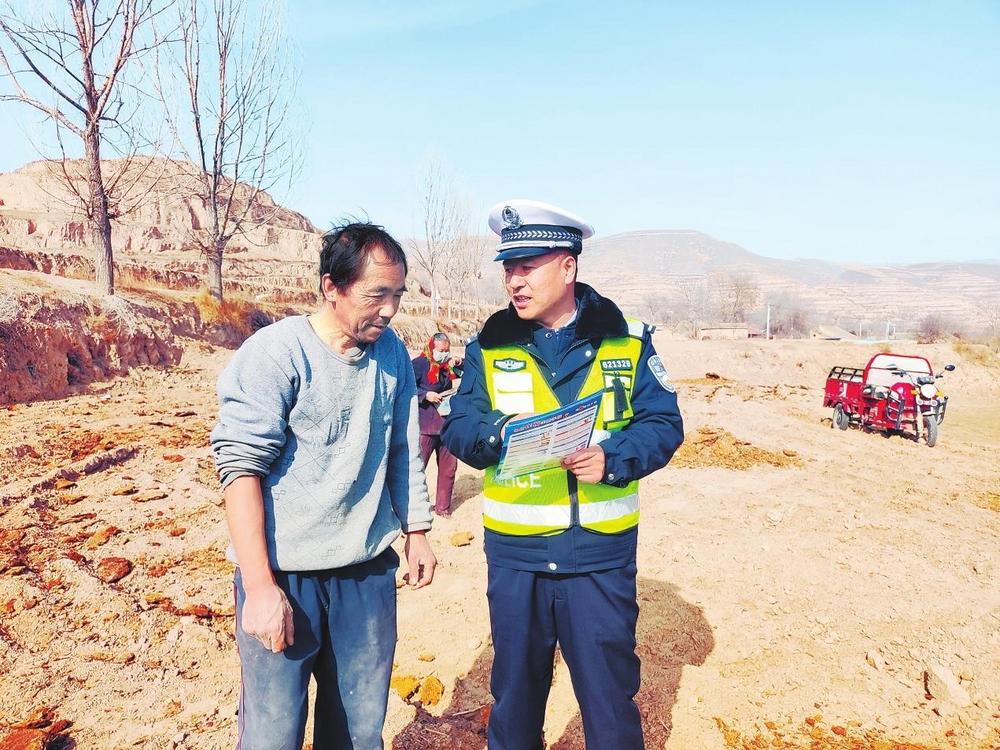 民警向群眾講解法律法規(guī)。3月10日,隴西縣公安局渭陽(yáng)派出所民警深入田間地頭,開(kāi)展道路交通安全和反電詐宣傳。 新甘肅·甘肅法治報(bào)通訊員劉榮攝