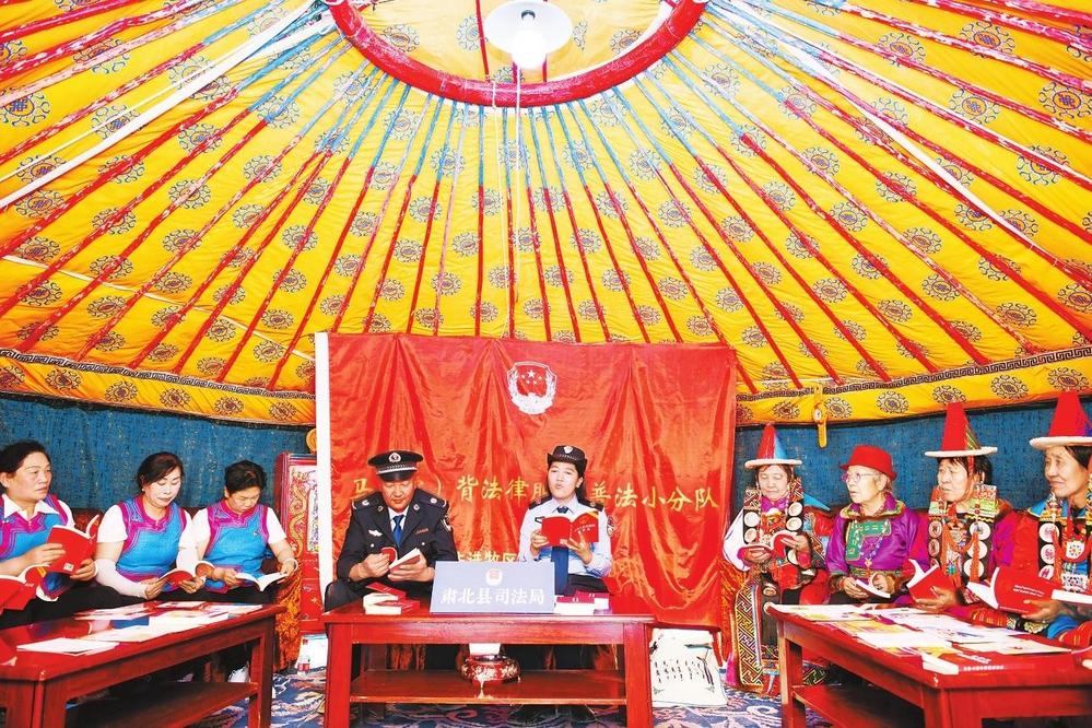 “西出陽(yáng)關(guān)無(wú)故人,而今法治伴我行。”在肅北蒙古族自治縣,黨河峽谷的風(fēng)裹挾著悠揚(yáng)的馬頭琴聲,將“法治烏蘭牧騎”的歌聲傳向遠(yuǎn)方;