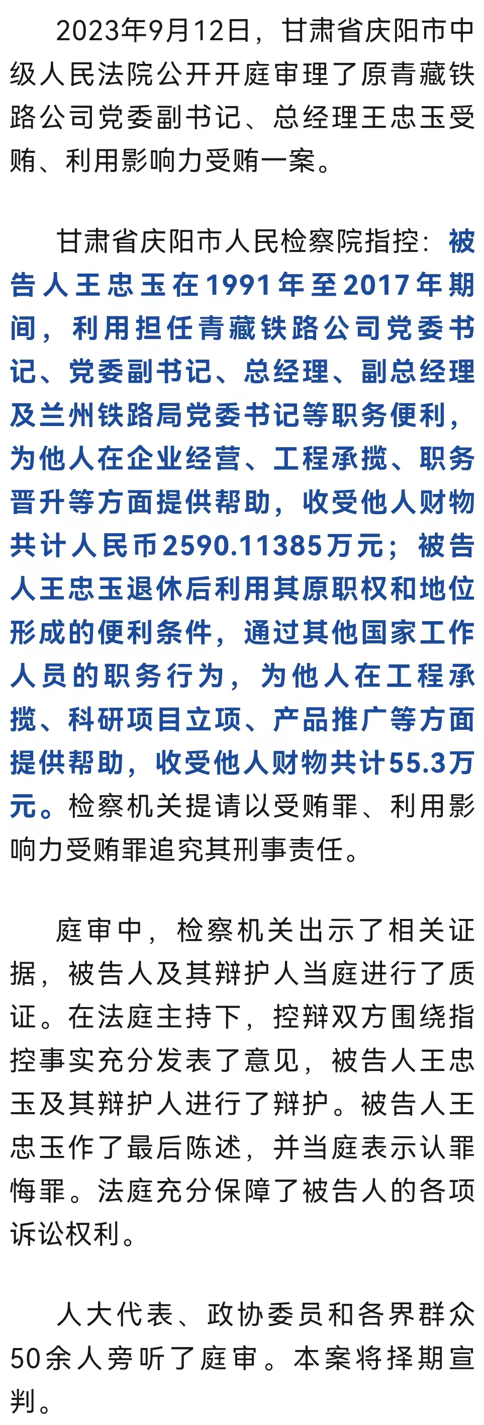 原標(biāo)題:《原青藏鐵路公司黨委副書記、總經(jīng)理王忠玉受賄、利用影響力受賄案一審開庭》
