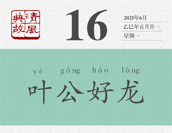 西漢劉向《新序·雜事》有一則寓言:“葉公子高好龍,鉤以寫龍,鑿(通‘爵’,酒具)以寫龍,屋室雕文以寫龍。于是夫龍聞而下之,窺頭于牖,施(yì,延伸)尾于堂。 葉公見之,棄而還走,失其魂魄,五色無主。是葉公非好龍也,好夫似龍而非龍者也。”