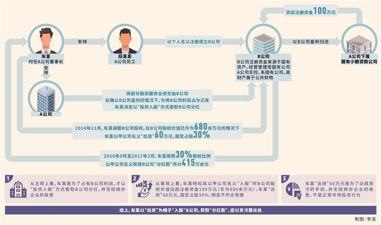 第二,車某的所謂出資行為并非市場投資行為,而是其利用職務便利獲取本屬于國有公司B公司的確定性預期收益的犯罪手段。本案中,車某明知其以甲公司名義“入股”時,B公司實際資產(chǎn)高于注冊資金100萬元。經(jīng)查,在車某以甲公司名義“入股”B公司時,B公司實際股權(quán)價值為680余萬元,車某“出資”60萬元占股30%,明顯不符合常理,換言之,車某“出資”60萬元不應獲得30%股權(quán)。車某的真實目的是在不承擔市場風險的前提下,利用擔任A公司董事長的職務便利,將A公司確定能夠盈利的融資業(yè)務交給B公司經(jīng)營,并在確認B公司能夠盈利的情況下,以“出資”為幌子“入股”B公司,獲取“分紅款”,應以貪污罪論處。