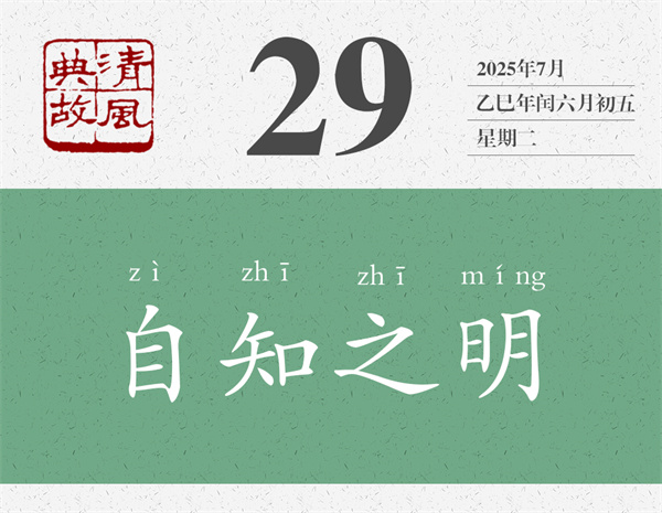 《老子•三十三章》:“知人者智,自知者明。勝人者有力,自勝者強。知足者富。強行者有志。不失其所者久。死而不亡者壽。”陳鼓應先生譯為:認識別人的是“智”,了解自己的才算“明”。戰(zhàn)勝別人的是有力,克服自己的才算堅強。知道滿足的就是富有。努力不懈的就是有志。不離失根基的就能長久。身死而不朽的才是長壽。