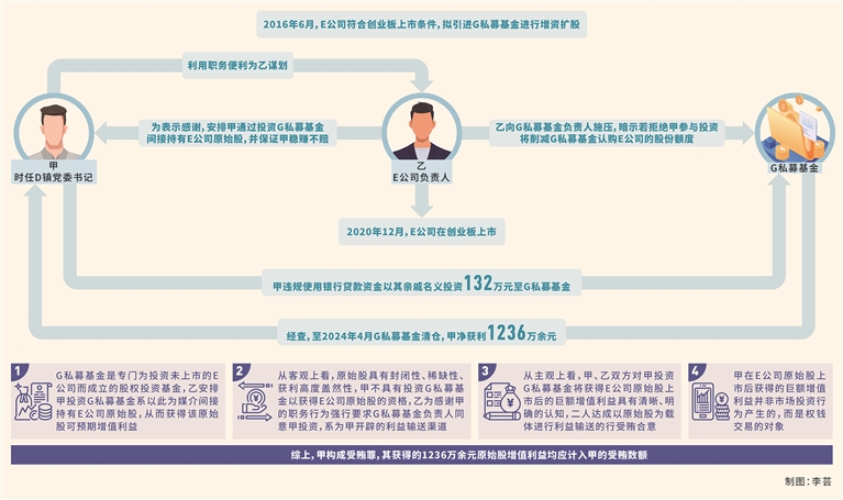 其中,2016年6月,E公司符合創(chuàng)業(yè)板上市條件,擬引進(jìn)G私募基金和H私募基金進(jìn)行增資擴(kuò)股。乙為感謝甲在企業(yè)用地審批等方面提供的幫助,提議安排甲通過投資G私募基金(該基金是專門為投資未上市的E公司而成立的股權(quán)投資基金,按照每股5.5元的價(jià)格取得E公司股本600萬股,并辦理相應(yīng)的變更登記手續(xù))間接持有E公司原始股,并告知甲E公司擬上市情況以及其會(huì)與G私募基金簽訂對(duì)賭協(xié)議(若E公司未實(shí)現(xiàn)上市,G私募基金有權(quán)要求乙原價(jià)回購(gòu),并按照年利率10%支付補(bǔ)償款),甲無需承擔(dān)市場(chǎng)風(fēng)險(xiǎn),穩(wěn)賺不賠,甲表示同意。此后,乙向G私募基金負(fù)責(zé)人施壓,暗示若拒絕甲參與投資將削減G私募基金認(rèn)購(gòu)E公司的股份額度,并將該額度交由其競(jìng)爭(zhēng)對(duì)手H私募基金認(rèn)購(gòu)。隨后,甲違規(guī)使用銀行貸款資金以其親戚名義投資132萬元至G私募基金(根據(jù)相關(guān)規(guī)定,私募基金投資者應(yīng)當(dāng)具備相應(yīng)資金實(shí)力,不得用貸款資金從事股本權(quán)益性投資,甲的行為不符合規(guī)定)。2019年6月,I私募基金以每股11.52元溢價(jià)收購(gòu)G私募基金持有的部分E公司股份。2020年12月,E公司在創(chuàng)業(yè)板上市。經(jīng)查,至2024年4月G私募基金清倉(cāng),甲凈獲利1236萬余元。