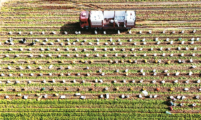 圖③:近日,河南省尉氏縣張市鎮(zhèn)張市村特色種植合作社的員工在種植園采收。新華社發(fā)(李新義 攝)