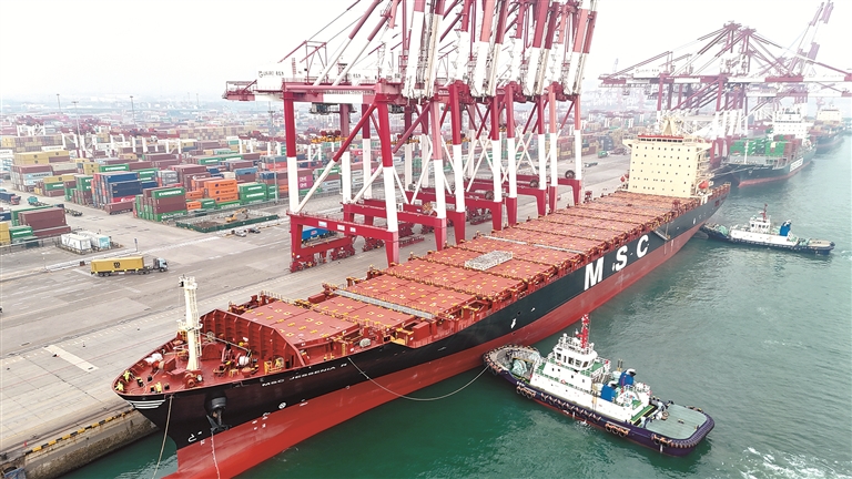 1月4日,澳洲直航新航線首班船舶靠泊山東港口青島港,標志著該港2026年首條外貿新航線正式開通。圖為澳洲直航新航線首班船舶——“地中海杰西尼亞”輪靠泊山東港口青島港。新華社發(fā)(張進剛 攝)