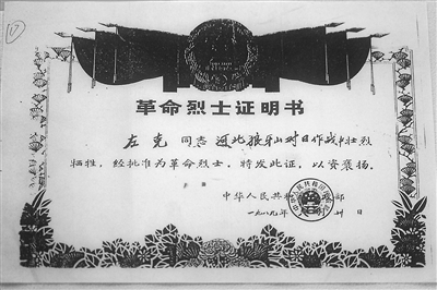 1989年中華人民共和國(guó)民政部頒發(fā)的左克革命烈士證明書。