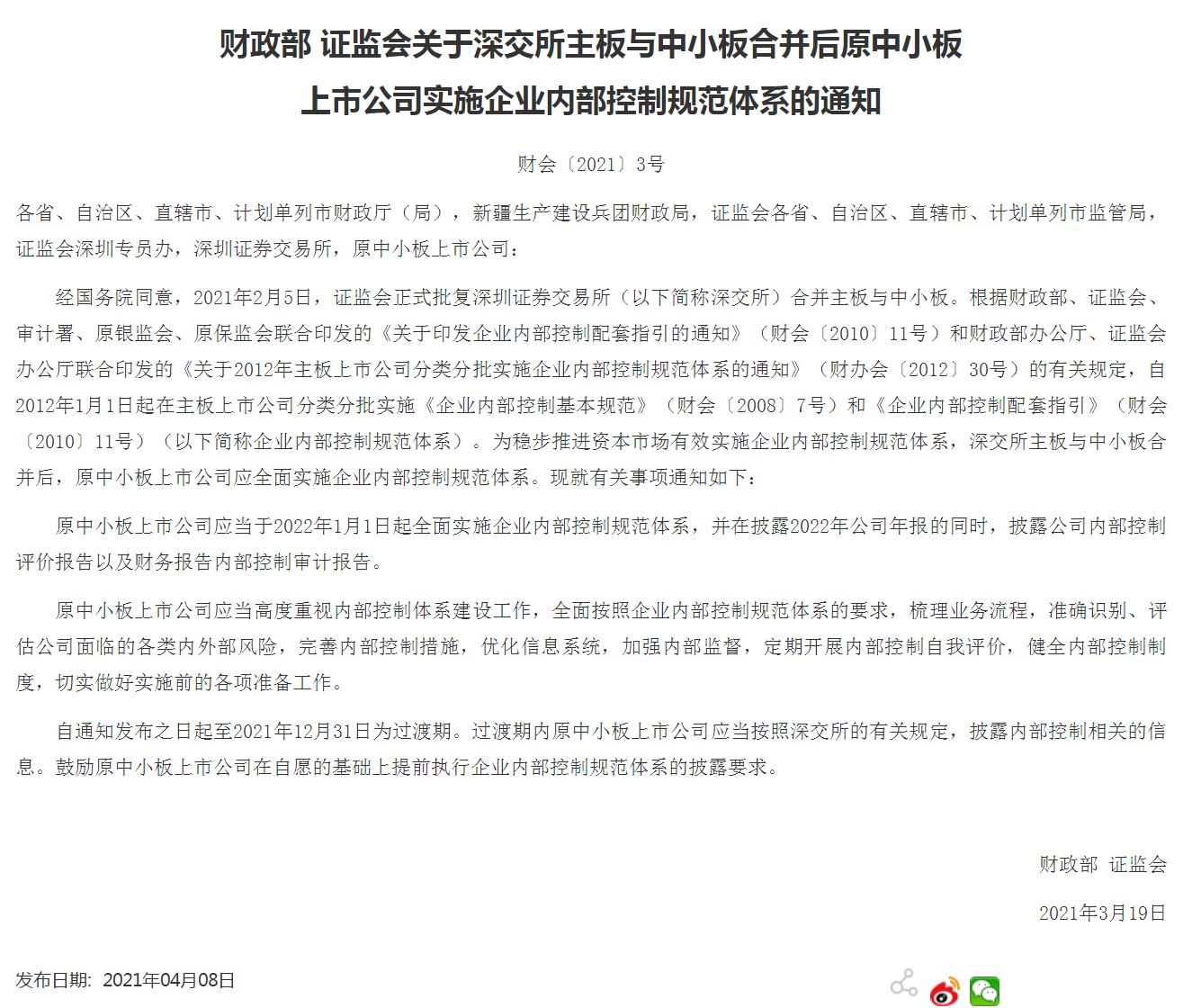兩部門:原中小板公司2022年1月1日起實(shí)施內(nèi)控規(guī)范體系