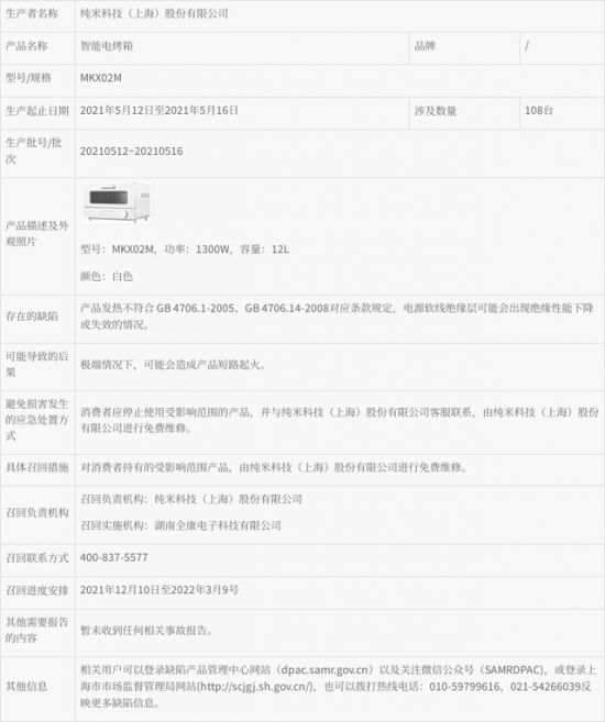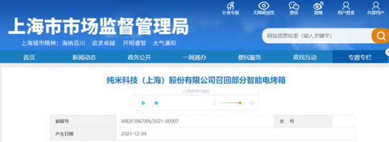 據(jù)上海市市場監(jiān)督管理局網(wǎng)站2021年12月9日消息,純米科技(上海)股份有限公司召回部分智能電烤箱。