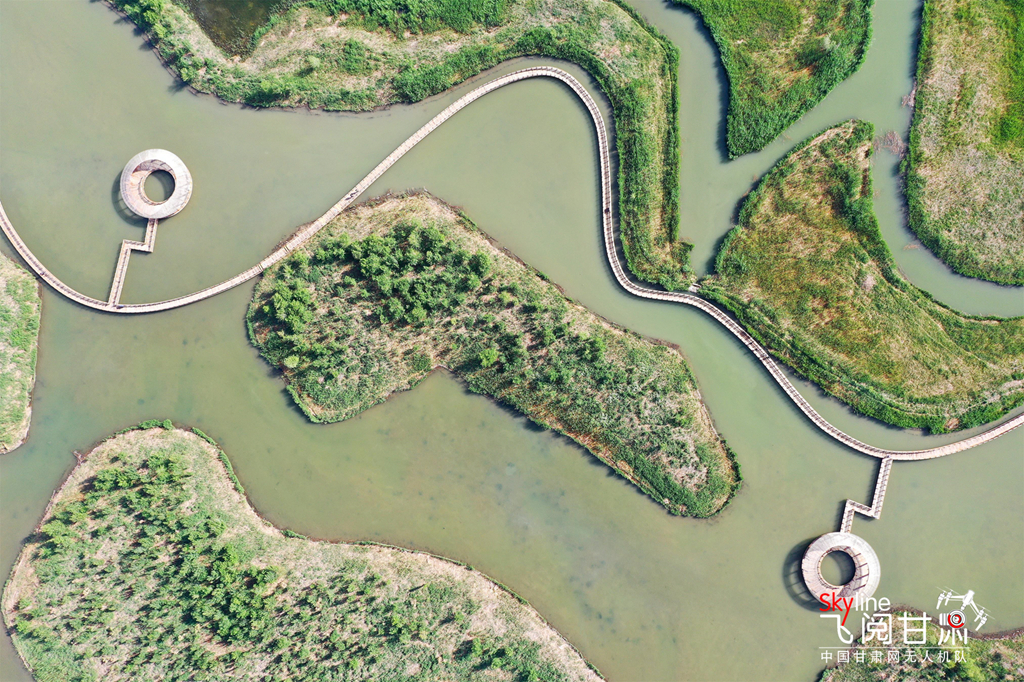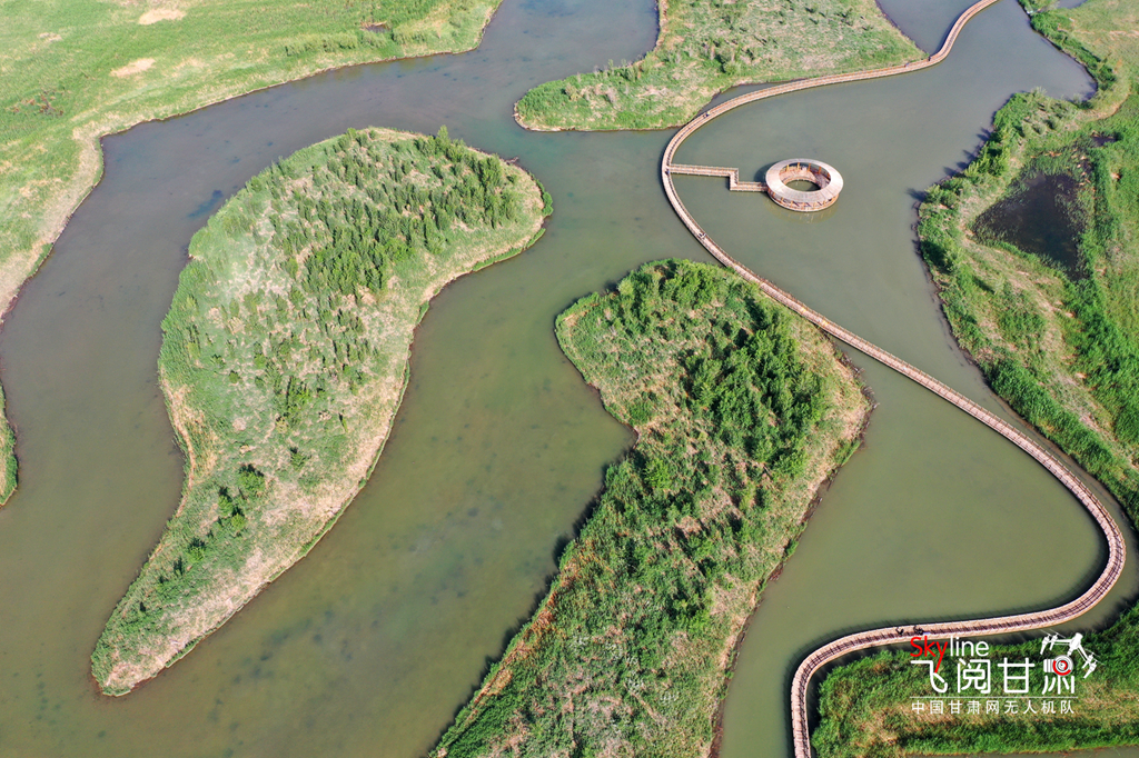 5月24日,甘肅省張掖國(guó)家濕地公園內(nèi)碧波蕩漾,湖面、樹木翠色欲滴,宛如一幅只用綠色渲染不用墨線勾勒的夏日畫卷。(無(wú)人機(jī)航拍)