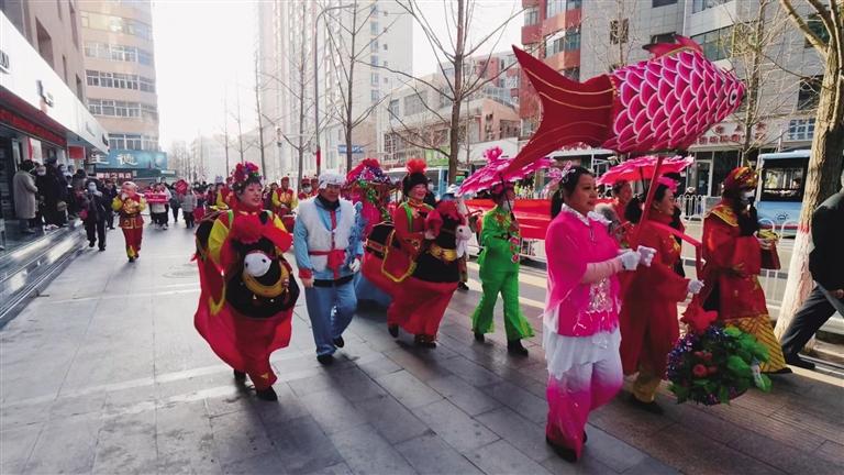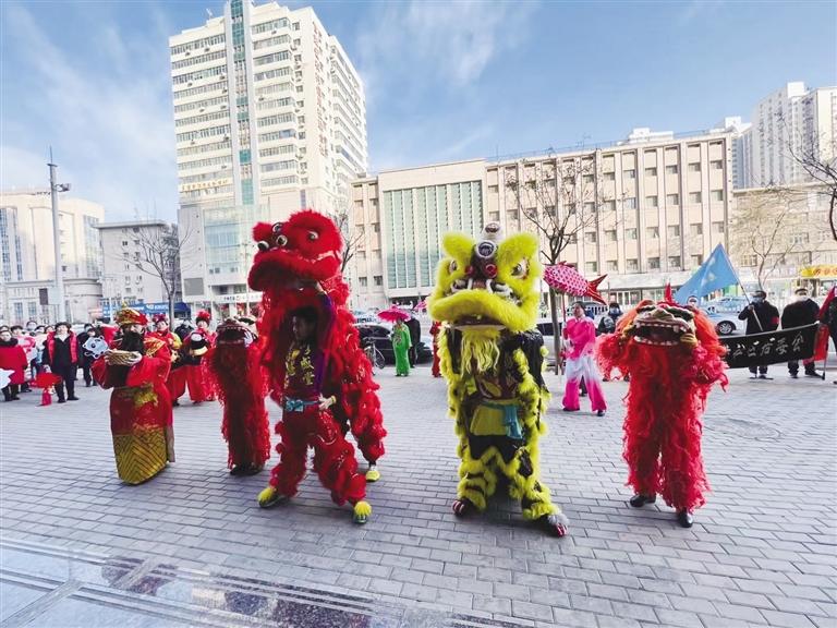 社區(qū)工作人員、舞獅隊(duì)、社火隊(duì)和大鼓隊(duì)為轄區(qū)居民帶來(lái)了扭秧歌、舞獅、敲大鼓、大頭娃娃和劃旱船等表演。