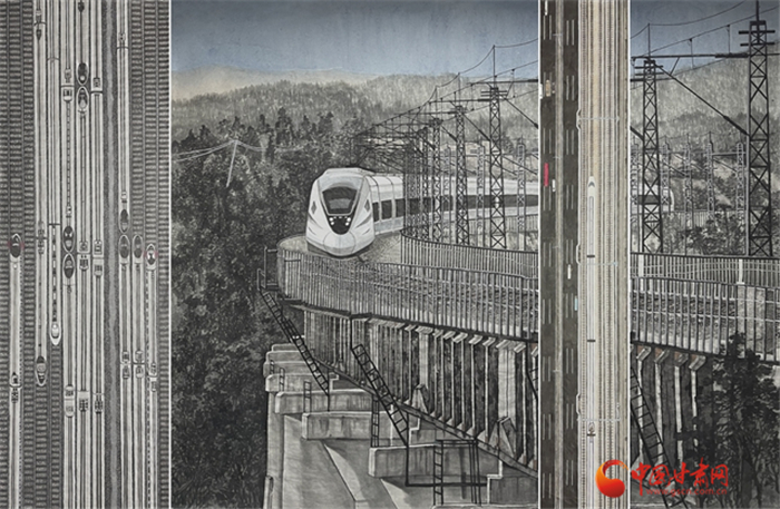 由甘肅畫院青年畫院劉峰至創(chuàng)作的國畫《中國高鐵進(jìn)大山》