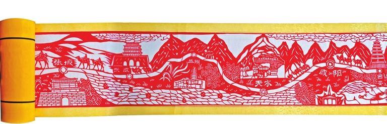 用剪紙藝術(shù)再現(xiàn)古絲綢之路的盛景,國家級非遺項目定西剪紙省級代表性傳承人付忠民經(jīng)過長時間的構(gòu)思和調(diào)研,又歷經(jīng)5個月,終于創(chuàng)作出了長達23.38米的剪紙長卷——《古絲綢之路全圖》,再現(xiàn)了絲路古道的文化藝術(shù)魅力,該長卷曾一舉創(chuàng)下世界紀錄協(xié)會“世界上最長的剪紙長卷”的世界紀錄。