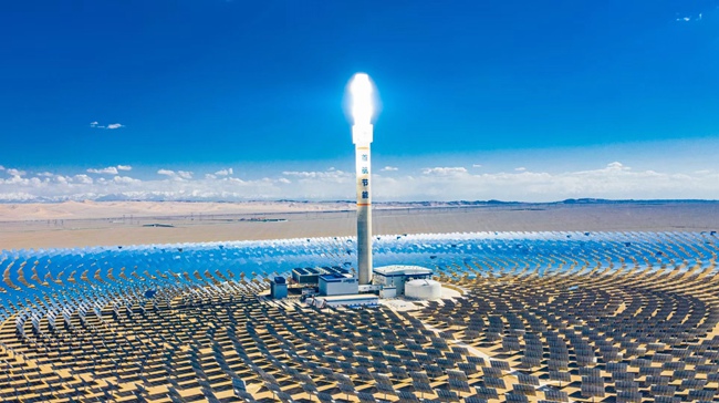 位于甘肅省敦煌市光電產(chǎn)業(yè)園區(qū)的首航高科敦煌100兆瓦熔鹽塔式光熱電站內(nèi),1萬余面定日鏡以同心圓狀圍繞著260米高的熔鹽塔逐日發(fā)電。敦煌市委宣傳部供圖