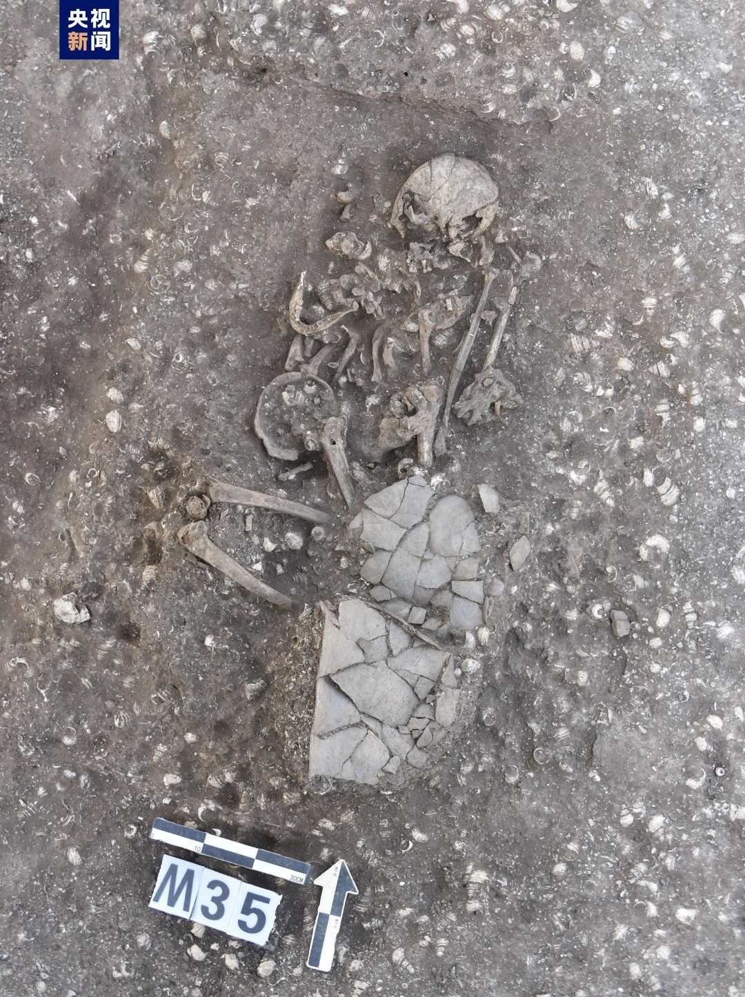 古城村遺址面積約4.2萬(wàn)平方米,現(xiàn)存的貝丘堆積最厚處達(dá)6.5米,由大量尾部被敲破的螺螄殼與灰土層交替堆疊形成。碳十四測(cè)定年代為距今3600至2500年,約相當(dāng)于中原地區(qū)的商代至兩周時(shí)期。商代遺存可分為早晚兩段,早段發(fā)現(xiàn)保存完整的橢圓形環(huán)壕聚落,由中心臺(tái)地、外圍環(huán)壕和護(hù)坡組成,中心臺(tái)地面積約27000平方米,環(huán)壕和護(hù)坡周長(zhǎng)約600米,這種聚落格局一直延續(xù)至兩周時(shí)期。商代晚段發(fā)現(xiàn)一批土坑墓和甕棺葬。兩周時(shí)期的遺存以房址、螺殼堆、灰燼、活動(dòng)面等居住類遺跡為主,房址多為方形半地穴式。出土青銅器、陶器、玉器、石器、骨器、木器等文物4000余件。