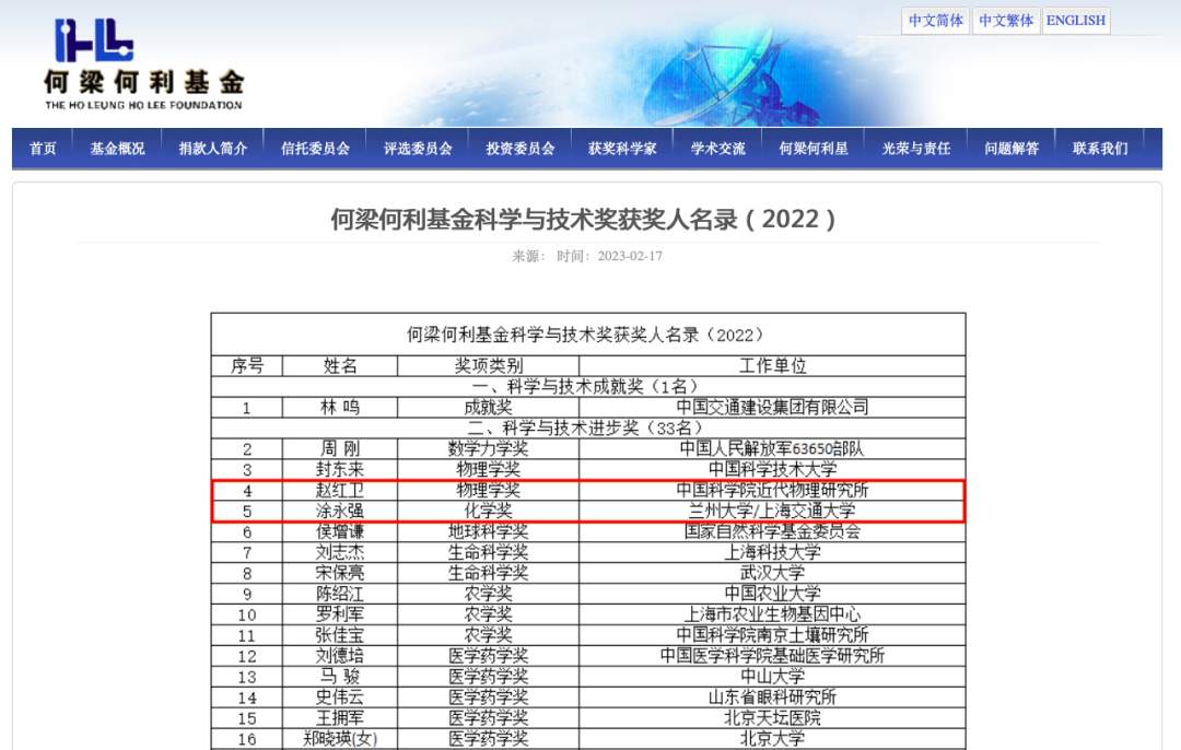 日前,何梁何利基金2021和2022年度頒獎(jiǎng)大會(huì)在北京舉行,共授予112名杰出科技工作者。其中,中國(guó)科學(xué)院近代物理研究所趙紅衛(wèi)、蘭州大學(xué)涂永強(qiáng)榮獲2022年度何梁何利基金科學(xué)與技術(shù)進(jìn)步獎(jiǎng)。