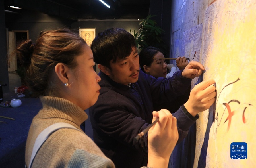 2月22日,在敦煌小鎮(zhèn)鳴沙書院,藝術(shù)工作者張杰龍(中)指導(dǎo)學(xué)員臨摹敦煌壁畫。